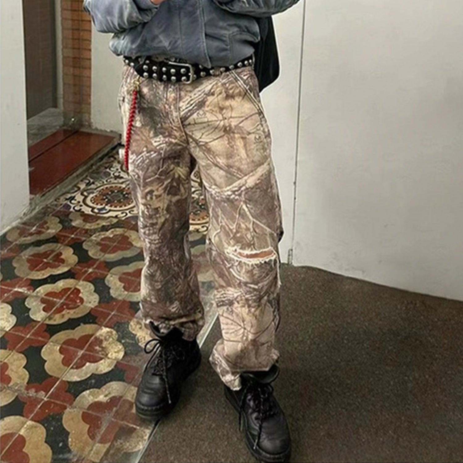 MIJKO Men's Vintage Pants MIJKO slim-fit trousers men's and women's straight camouflage old faded jeans