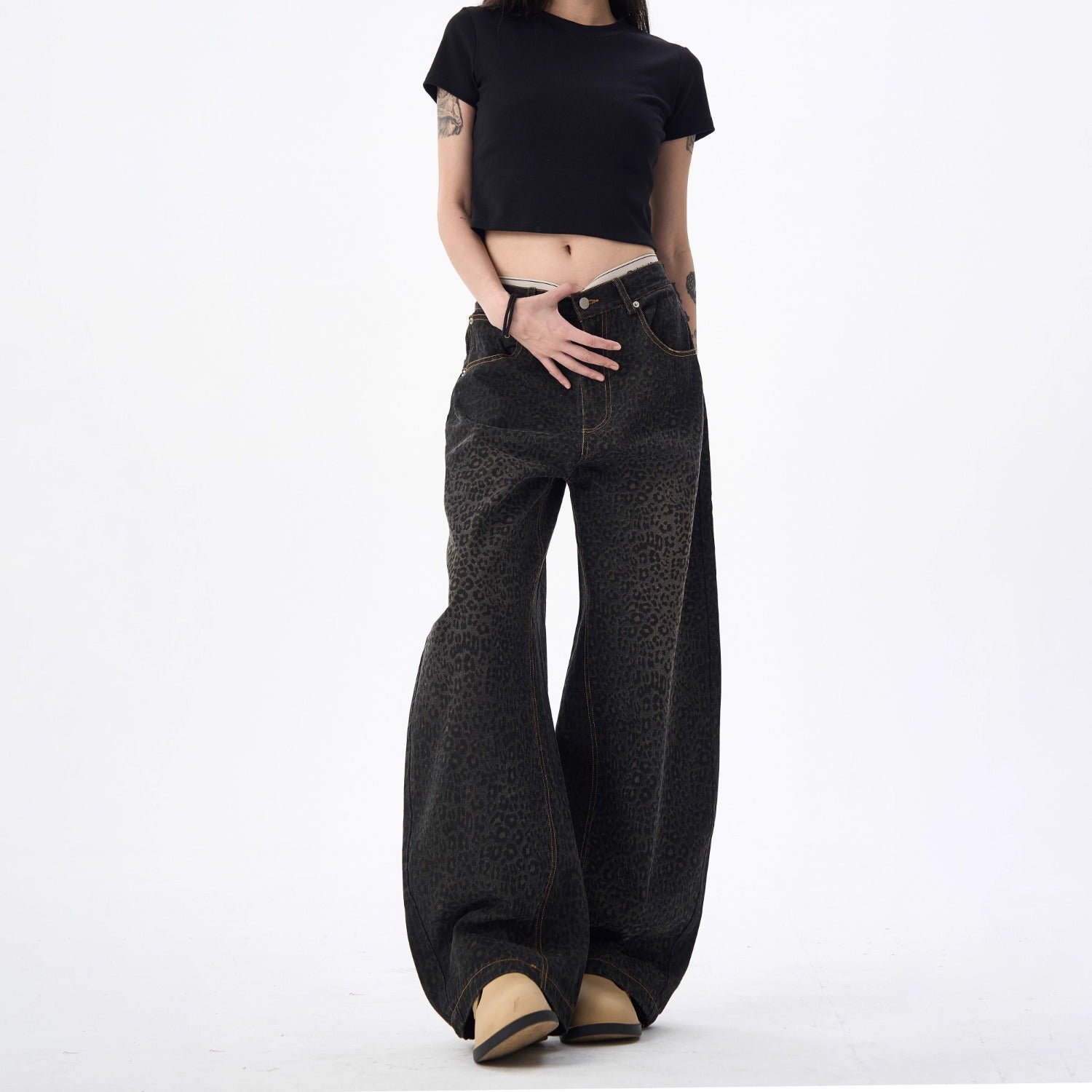 Women's jeans retro leopard-print scimitar jeans wide-leg trousers