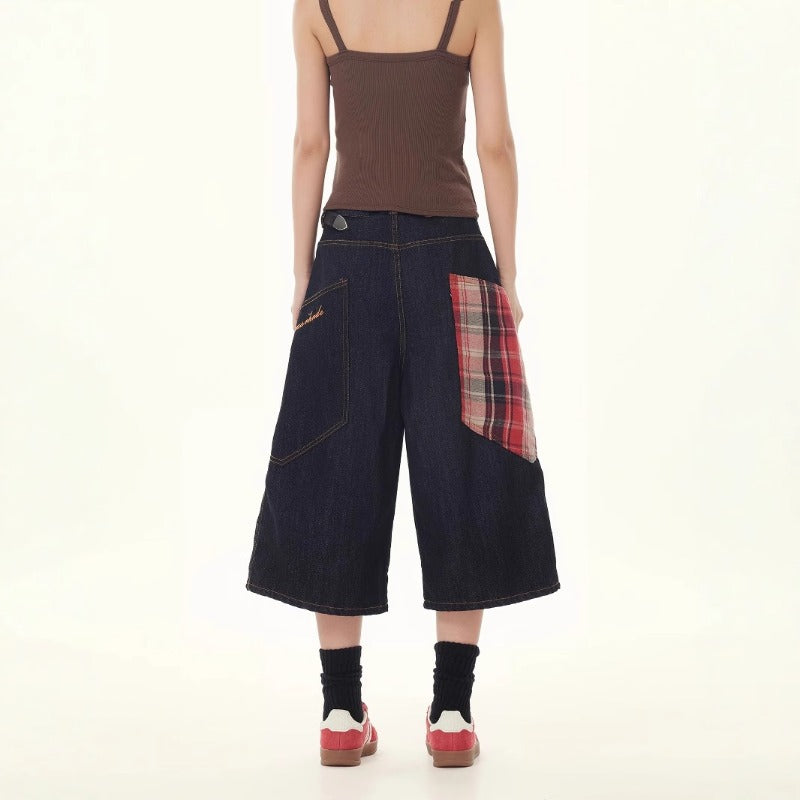 Women's jeans retro plaid stitching seven-point jeans women's loose
